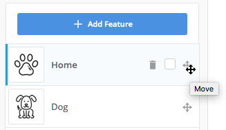 In Design module, click Add Feature and choose the feature you want. New menu items are always added at the bottom of the menu.