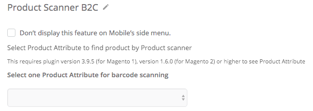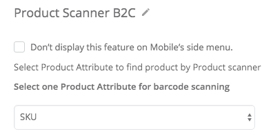 In JMango360 Back Office, navigate to the Design module > Add Feature > Product Scanner B2C. By default, the scanner is associated with NO product attribute, thus it will work based on ALL product details in the database. You can choose one product attribute for barcode scanning.