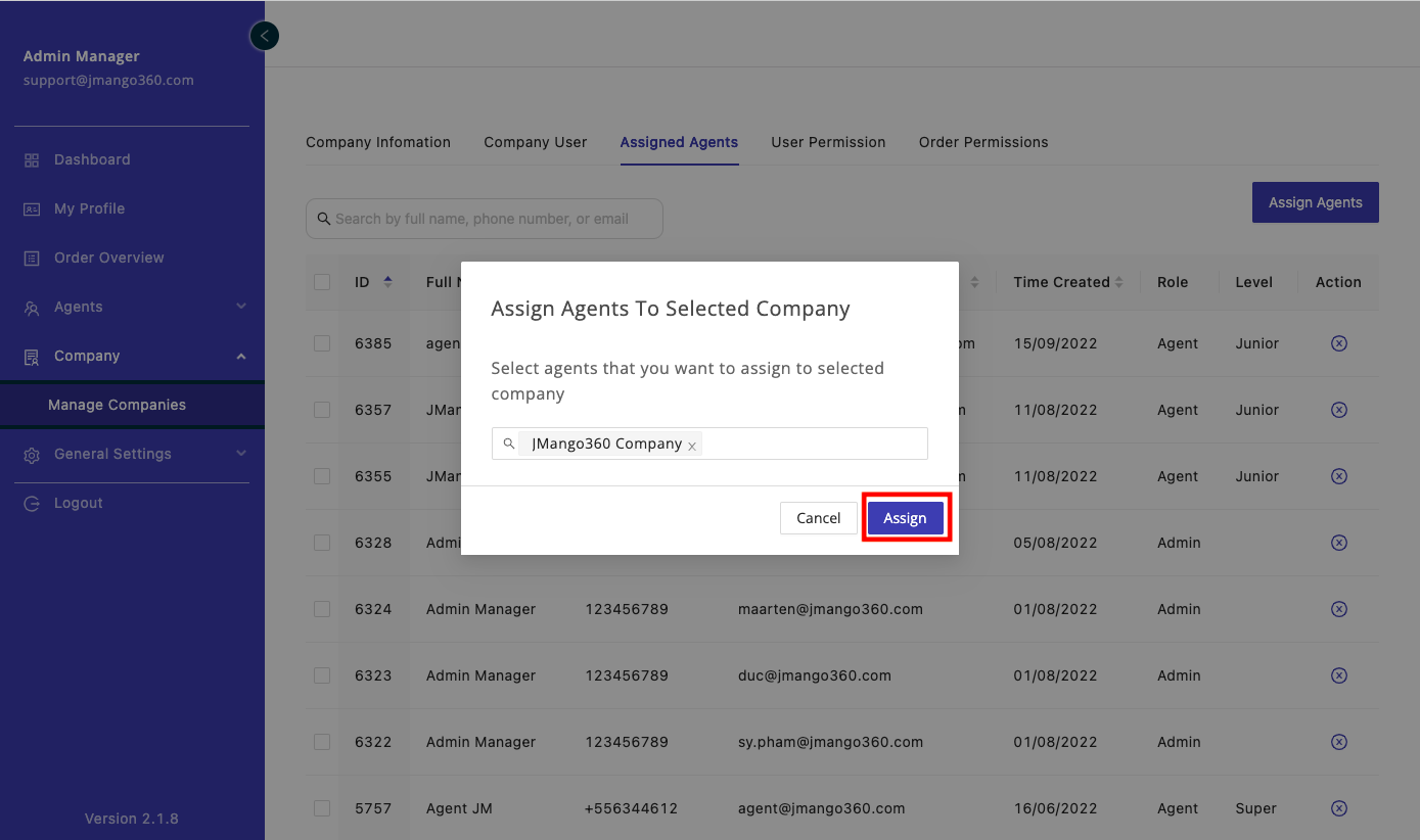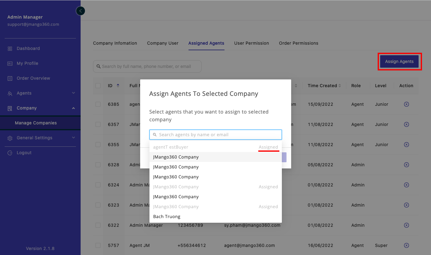 How: Click Assign Agents, then choose agents that Admin wants to assign to the selected company. Once the agent is selected, it will display Assigned. Agents that show Assigned will not be selected.