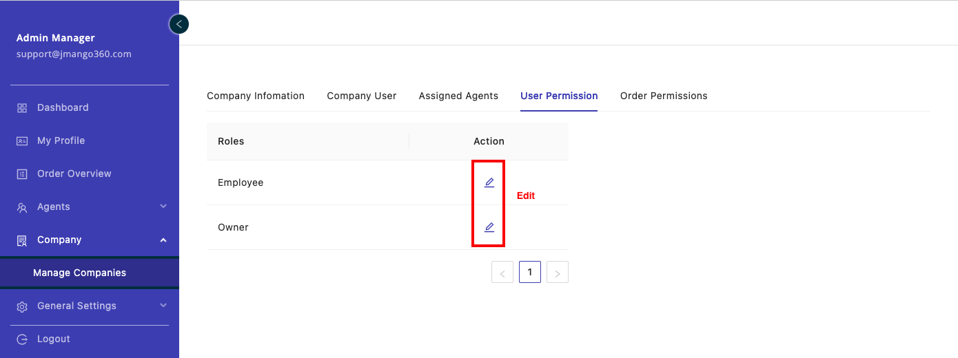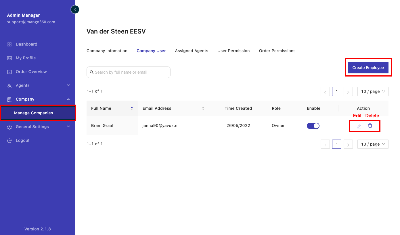 Action: Admin can delete or edit the company's data. Super Agent can only view the company's data detail.