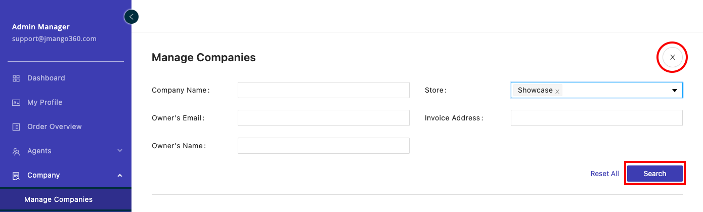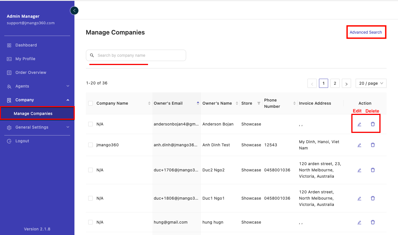 This feature allows Admin/Super Agent to search for a company by name or perform an advanced search.