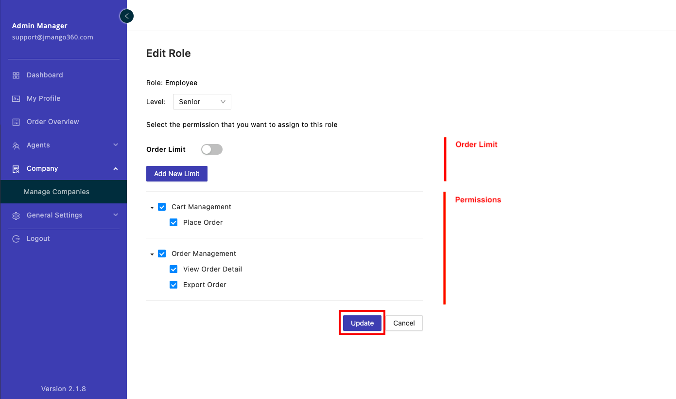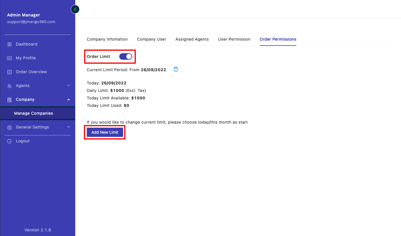 This feature also allows to set up Order limits for the whole company, which will be calculated by the sum of all employees and Owners within the company.