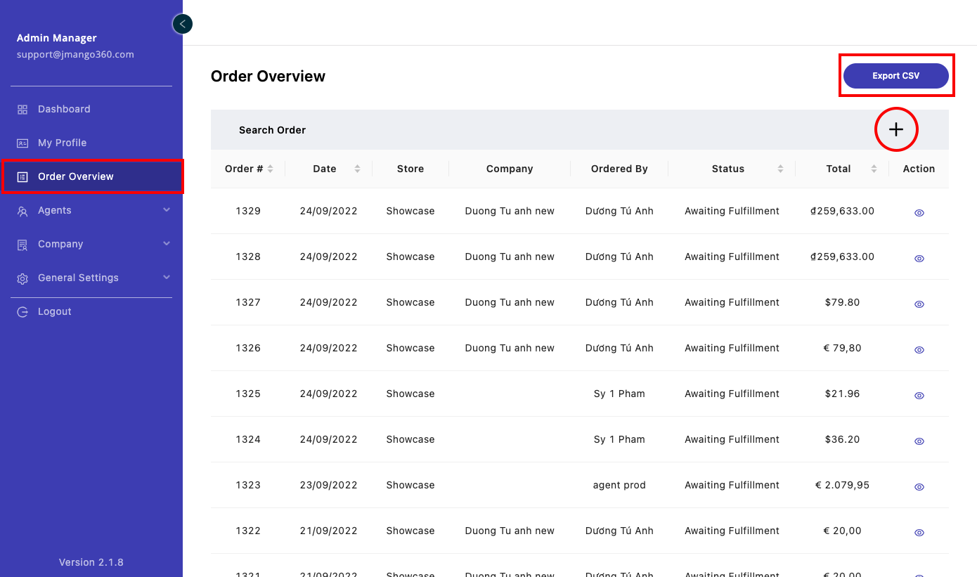 Admin can see the list of all orders from all companies made on Storefront. Agents can see the list of orders from assigned companies.