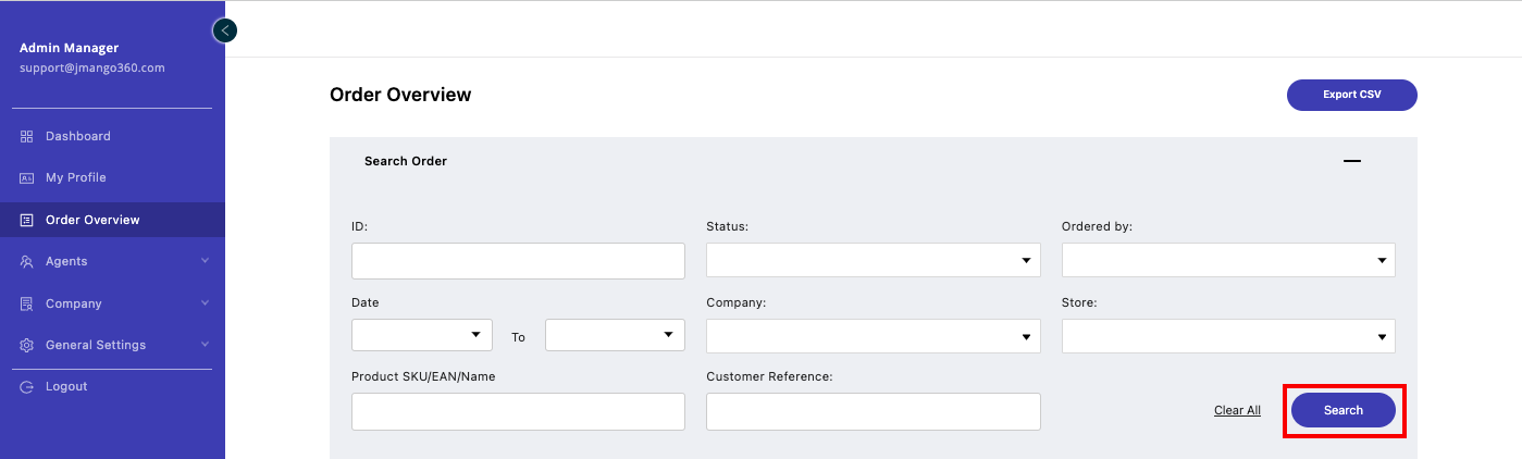 The admin/agent can search for order information by filling in the fields in Search Order Section