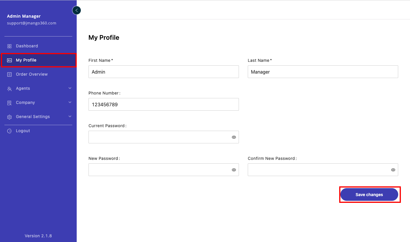 Agent/ Admin can Edit their Profile here, then click Save Changes to apply the changes.