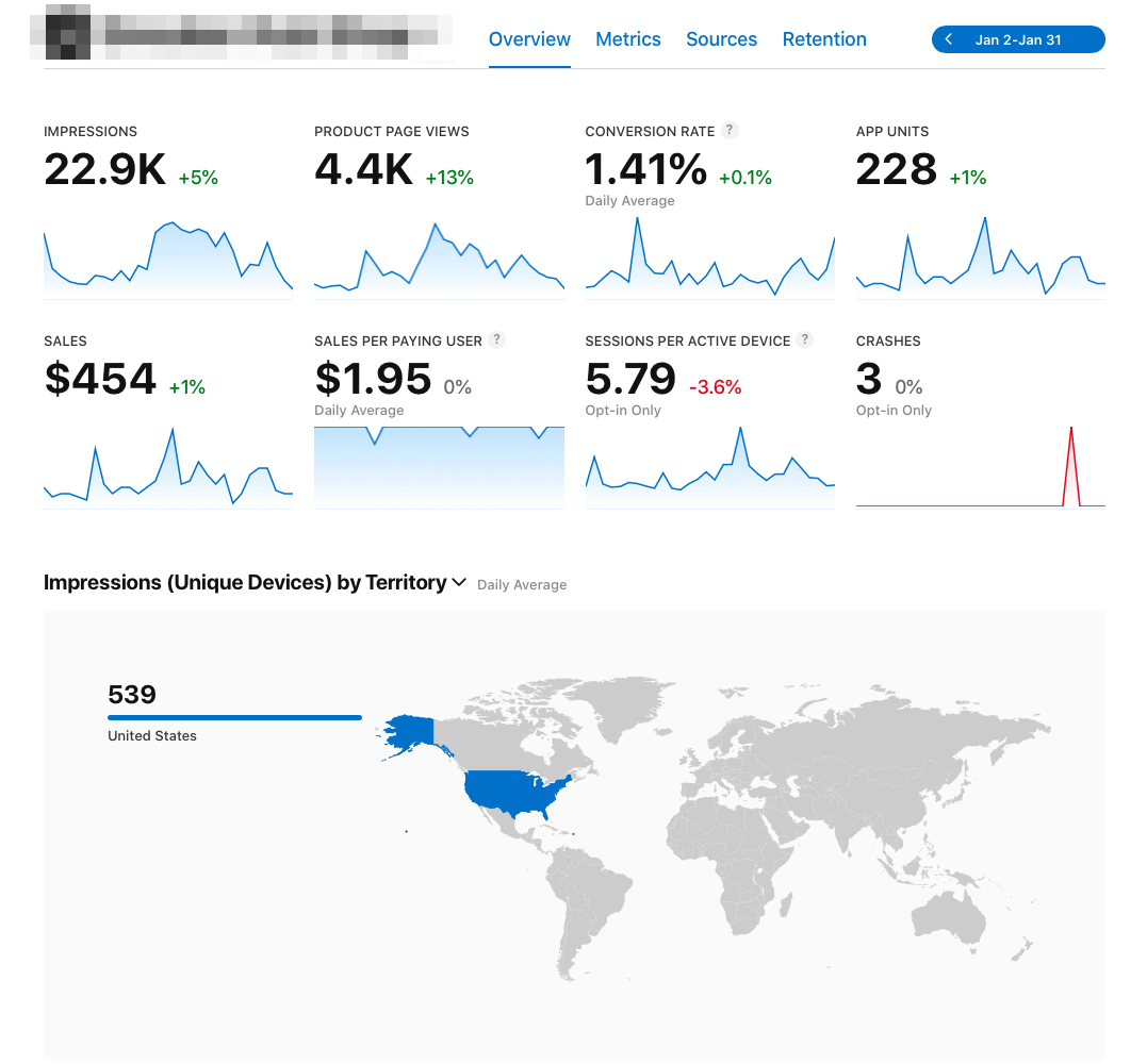 - Product Page Views: The number of times your app's product page has been viewed on devices running iOS 8 or later.
