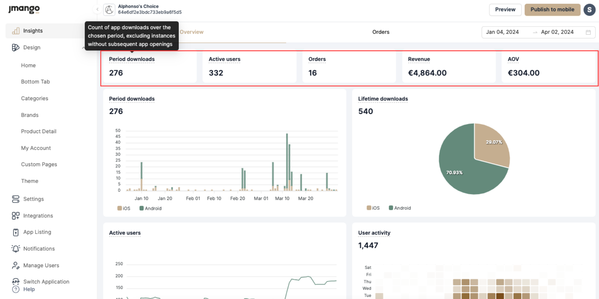 - Period downloads: Count of app downloads over the chosen period, excluding instances without subsequent app openings