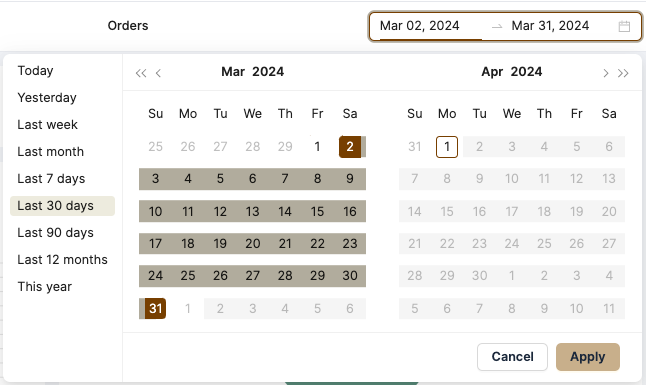 You can either choose from pre-defined time ranges or specify a custom range. Remember to click Apply after making your selection. Note that the pre-defined date ranges are counted up to yesterday.