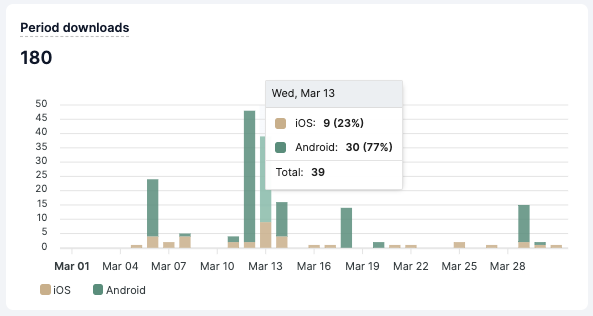 - Period downloads: Show count of downloads in time grouped by iOS and Android. This event is triggered when the app is first opened after download.