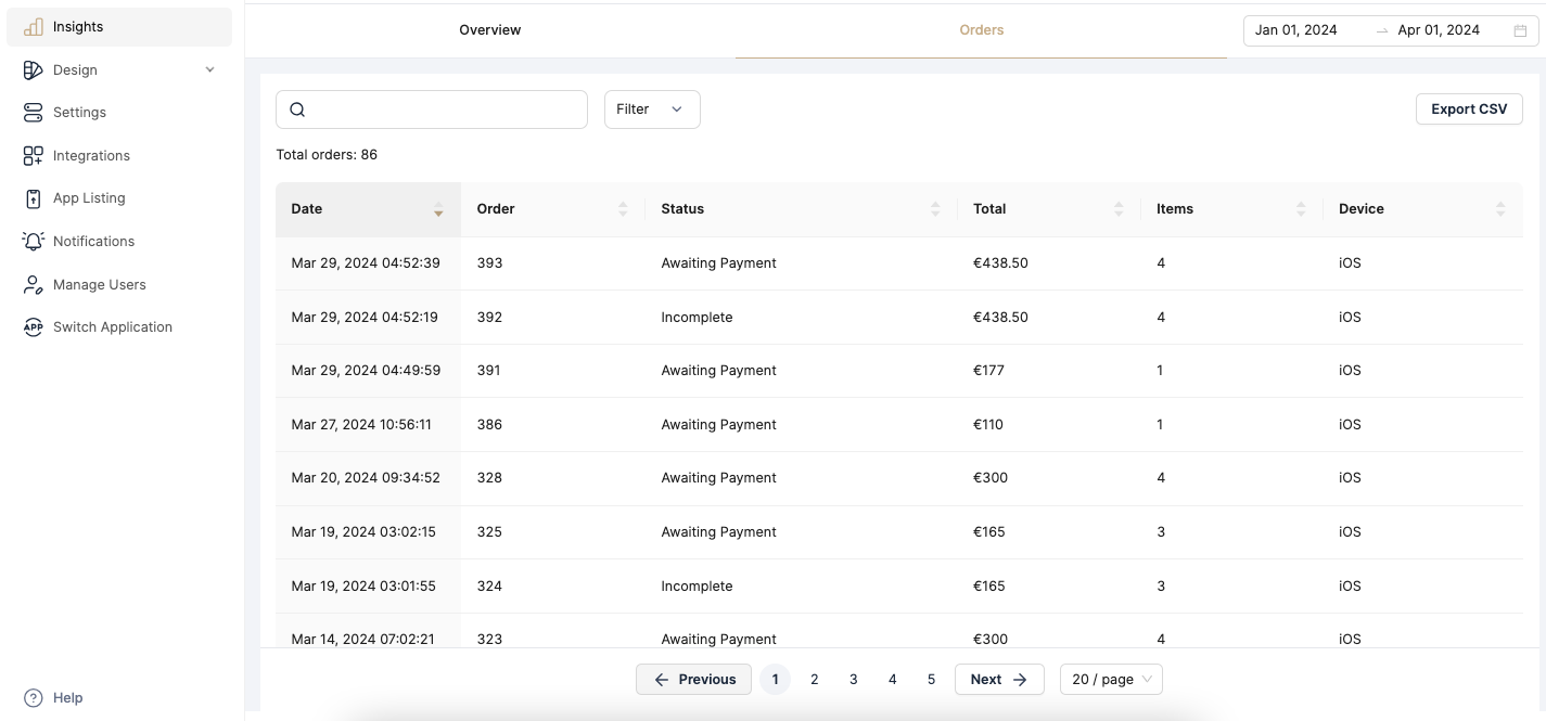 - Export CSV: Export orders to CSV under the name mobile-app-orders-startDate-to-endDate.csv.
