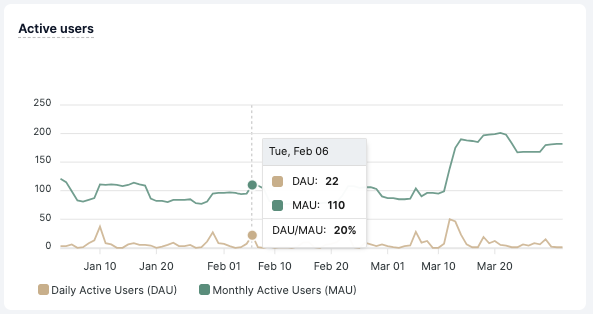 - Active users: Show active users in the last 24 hours (Daily Active Users - DAU) and in the last 30 days (Monthly Active Users - MAU). The DAU / MAU shows the so-called stickiness of your active users.