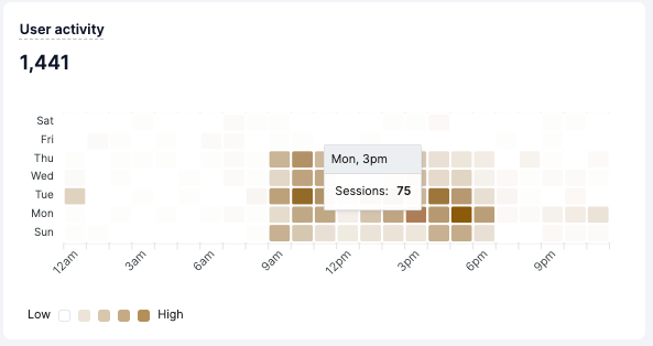 - User activity: The heat map shows your app activity throughout the week based on the specified time selected in the top right corner. Data is displayed using the viewer's browser timezone, so you can view the data in your local time.