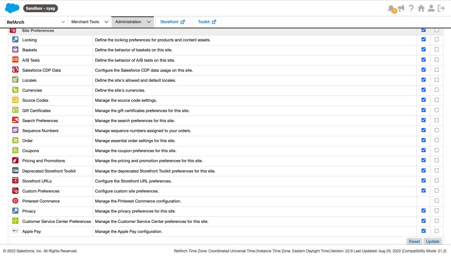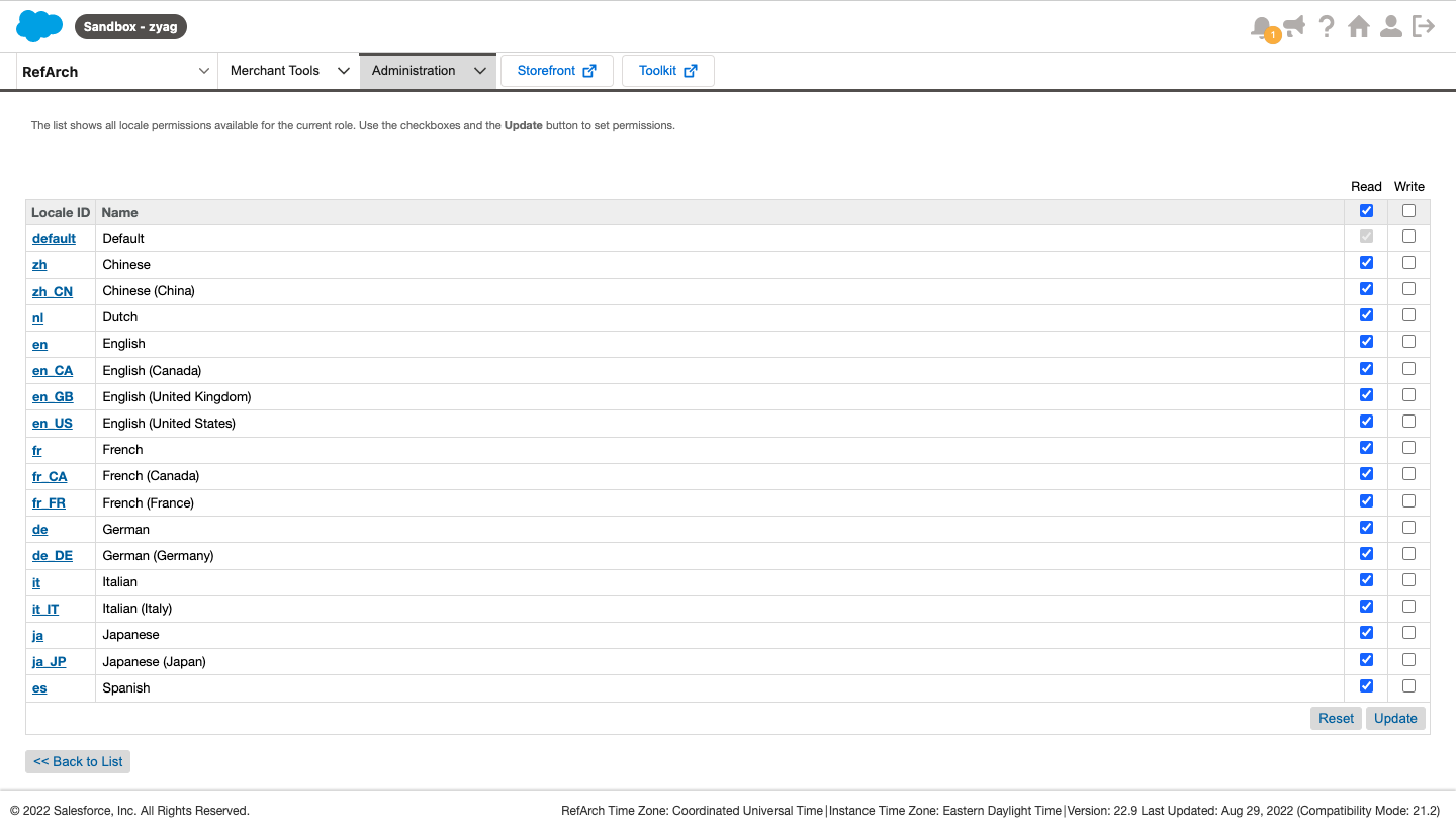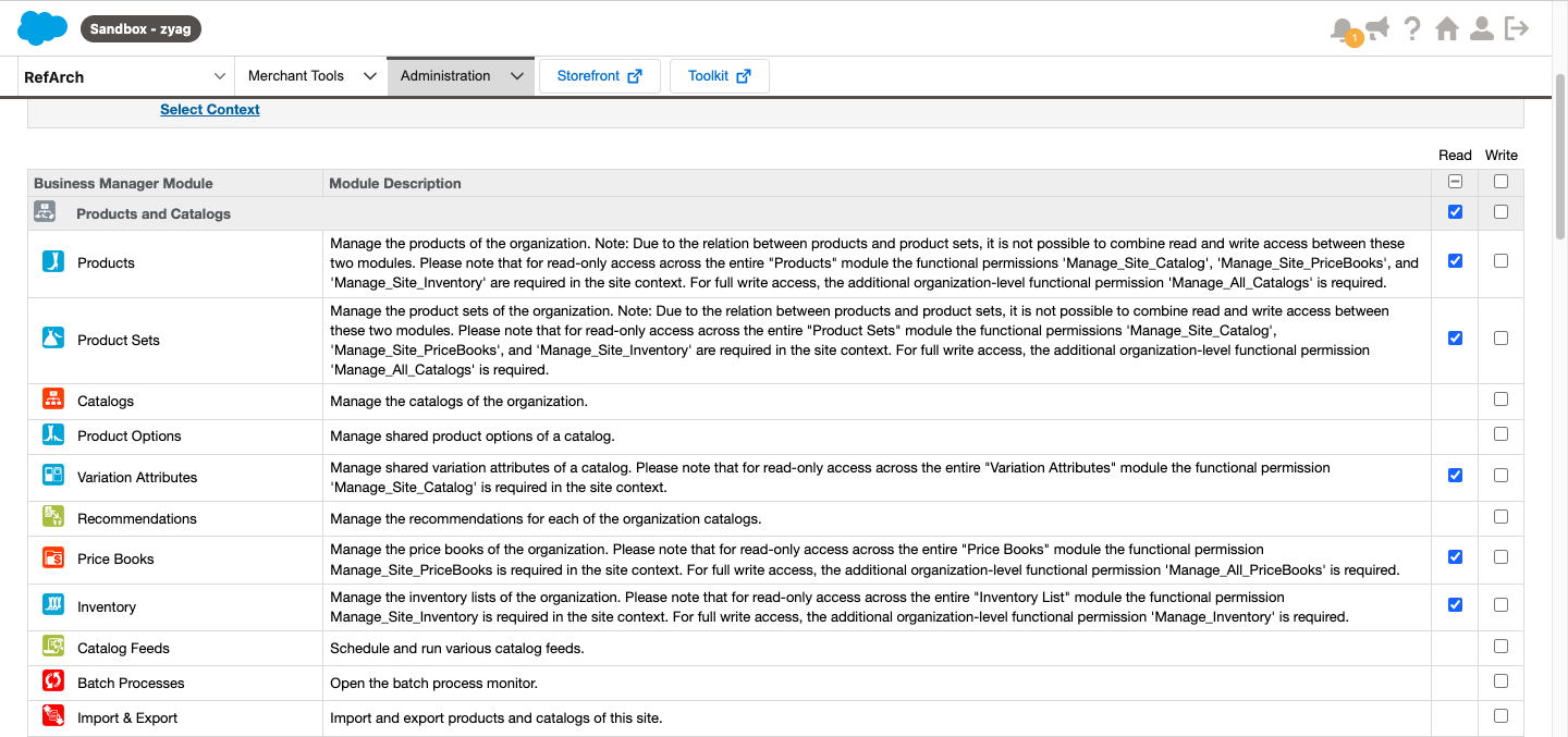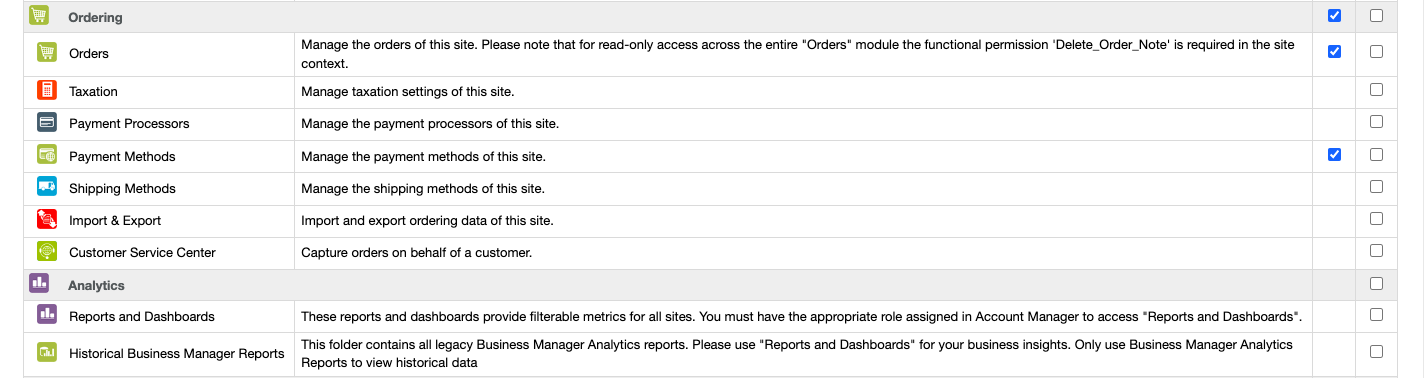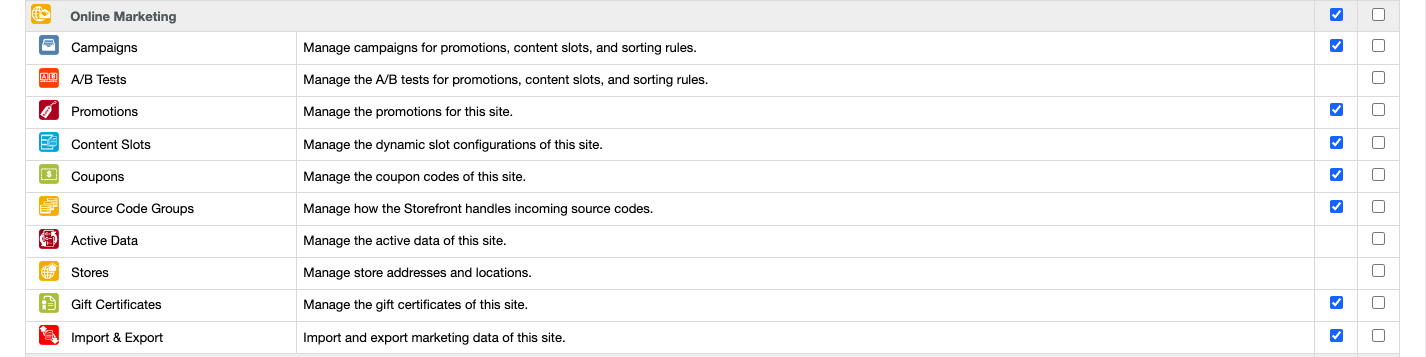 - VIEW permission: Catalog and all sub-criteria | Price Rules and all sub-criteria | Modules and Services and all sub-criteria | Shipping and all sub-criteria | Currencies | Taxes | Tax Rules | Preferences | General | Orders | Products | CMS | Search