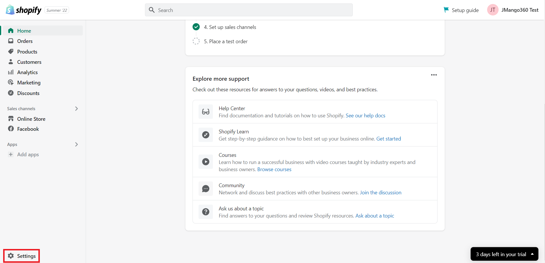 Step 1: Log in to the Shopify backend. Click on the Settings button at the bottom left to open the Settings window: