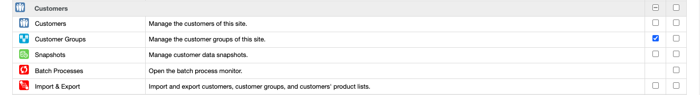 - VIEW permission: Catalog and all sub-criteria | Modules and all sub-criteria | Shipping and all sub-criteria | Payment and all sub-criteria | Currencies | Taxes and all sub-criteria | General and all sub-criteria | Order Settings and all sub-criteria | Product Settings and all sub-criteria | Customer Settings and all sub-criteria | Search and all sub-criteria