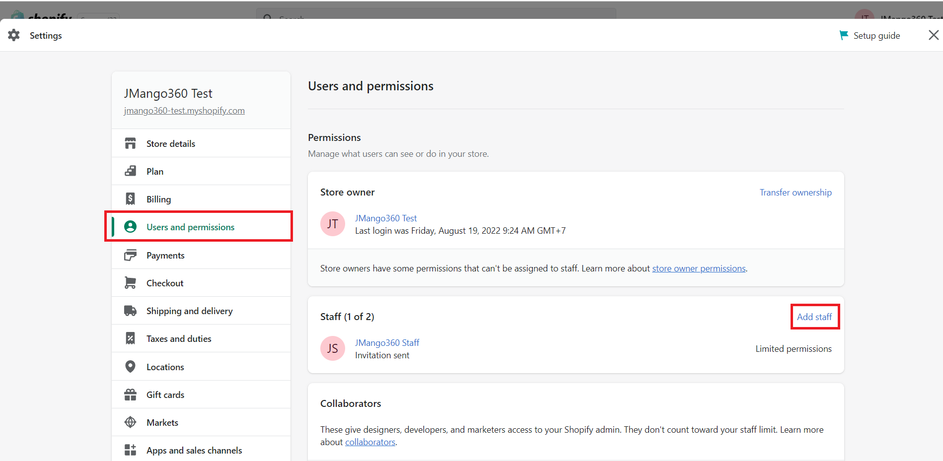 Step 2: On the menuside, choose Users and permissions. Then click on the button Add staff.