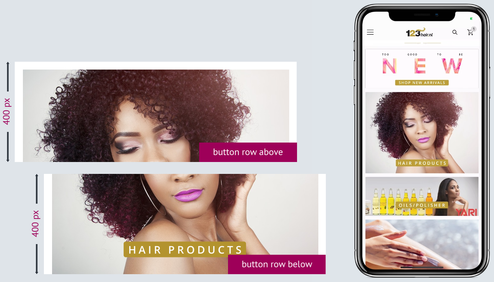 Slideshow is a great choice for sale promotions. You are allowed to create a slideshow of as many slides/images as you wish and disable the slideshow if you no longer want it. The recommended image size for slides is 1125 x 800 px. Regarding buttons, you are able to create multiple button rows, each of which is 400 px height and can contain no more than three buttons.