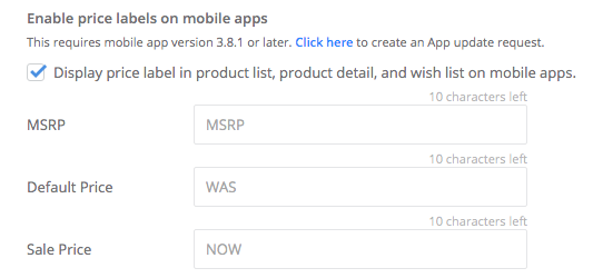 It is easy to customize the product price labels on your app. Just enable the setting Enable price labels on mobile apps and define the price labels as you would like.