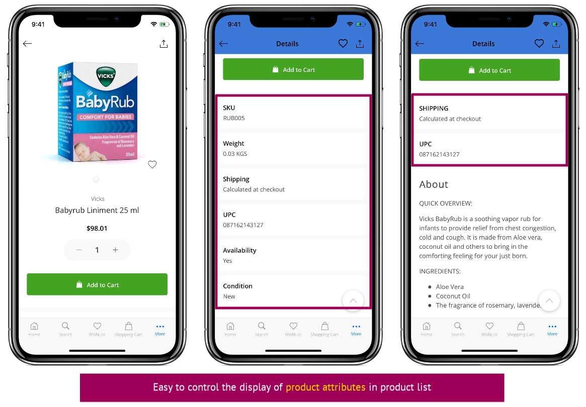 Besides pre-defined fields to display product attributes such as SKU, Weight, Condition, and UPC, BigCommerce allows you to create custom fields to display additional product attributes.