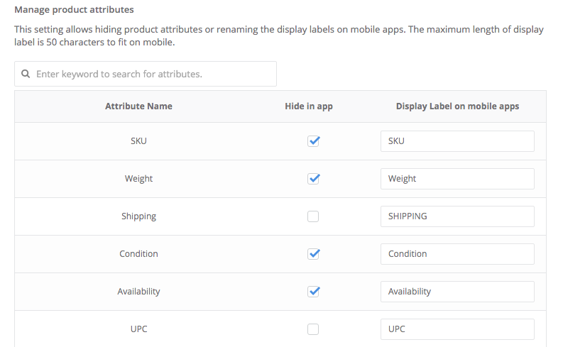 - Hide attributes: Select the Hide in app check box corresponding to the attribute you want to hide.