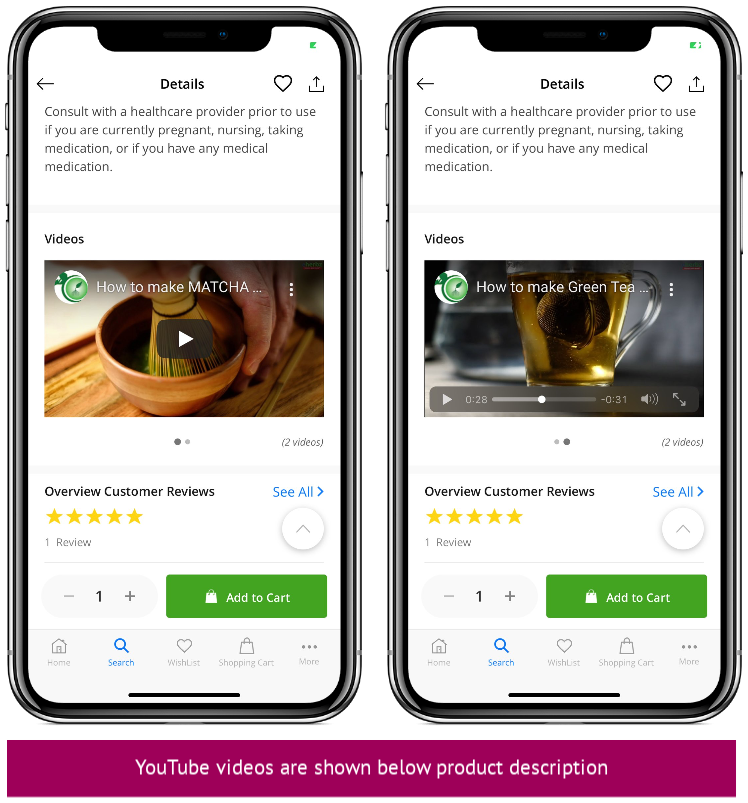 YouTube videos to a product. On mobile app, the videos will be shown below the product description section in the product details page. Your mobile customers can easily navigate between multiple videos by swiping left and right.
