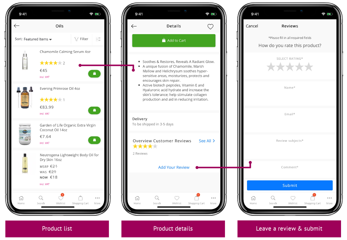 Product rating and reviews play an important role in building new customers' trust in the app and the brand. Product review is enabled by default and shown in the product list and product details. If you disable this setting, review rating and the Review section will be hidden.