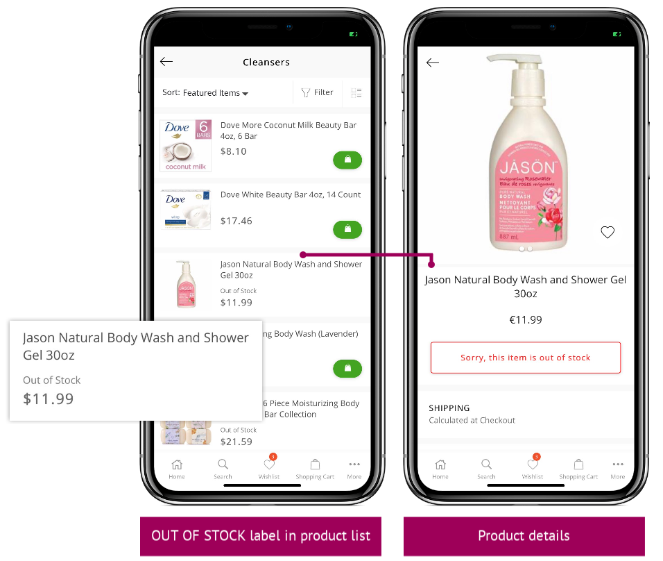 Your catalog can be configured to display the availability of each item as IN STOCK or OUT OF STOCK in the product details page. The configuration setting applies to the catalog as a whole, and the message changes according to the stock level of the product.