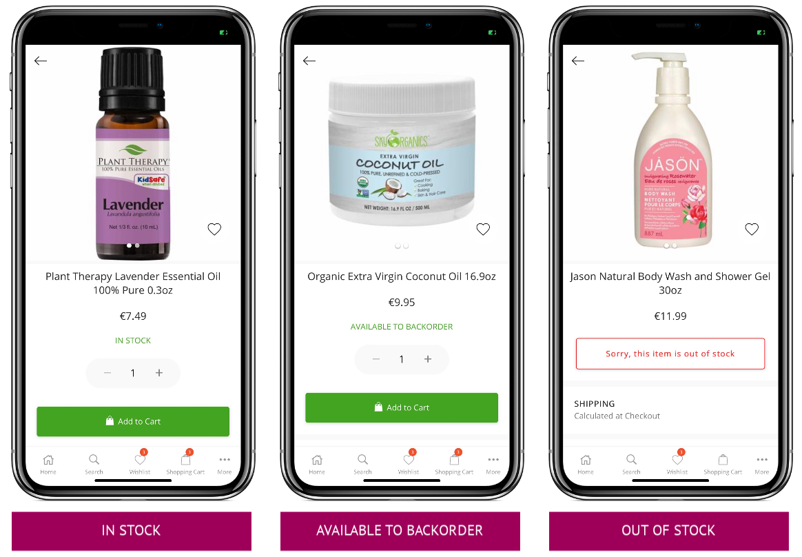 - Backorders OFF (default): Stock level displayed in PWA = Current stock level set in store backend