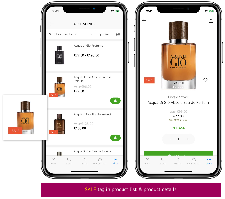 It's great to let customers know which products are on sale. This setting allows you to display the Sale tag for discounted products in product list, product details, search results, and wishlist.