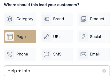 - In the design settings of the chosen block, under Where should this lead your customers?, select Page, then choose the custom page you want to link to.