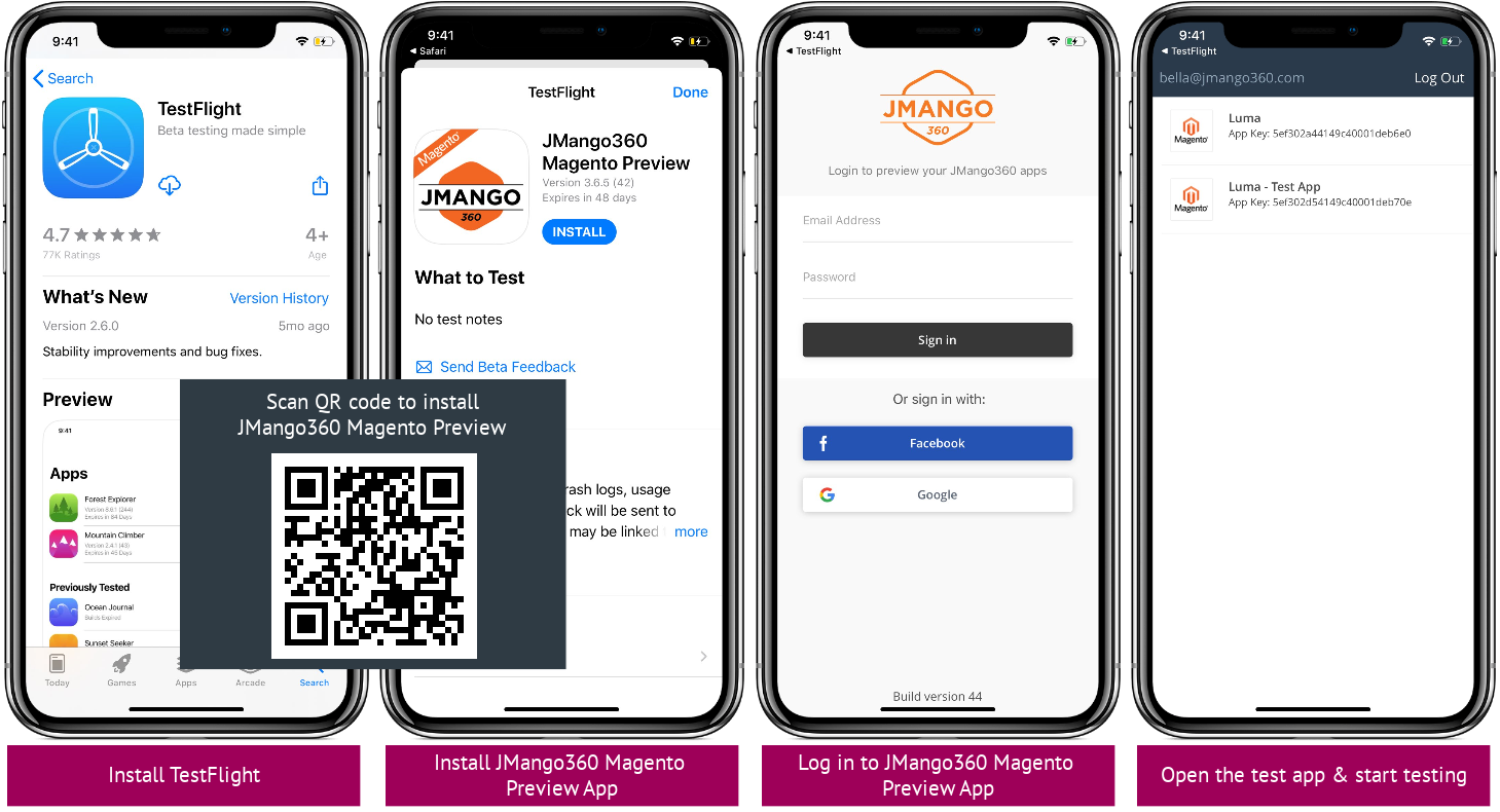 To fully test your app on iOS and Android devices, please install our free JMango360 Preview Apps. We have different Preview Apps for Native Apps, Magento React Native Apps, and BigCommerce React Native Apps.
