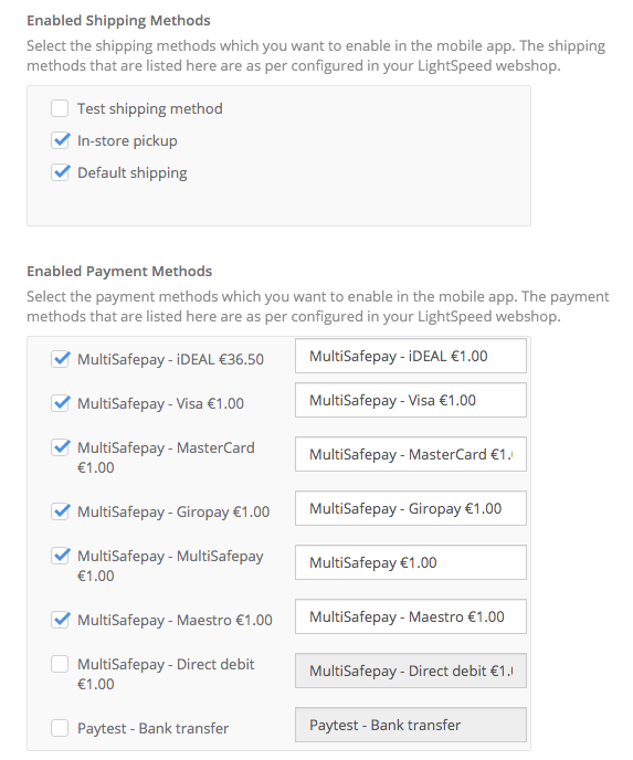 - The list of shipping and payment methods here are dynamic as per configurations in Lightspeed Back Office. If you make changes to the shipping and payment methods in Lightspeed Back Office, please re-integrate the app to have these changes take effect on app.