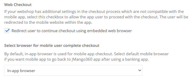 If you prefer to let your customers check out using web-based form, please turn the Web Checkout setting on. Web checkout takes place in an in-app browser by default. Due to technical limitations and your preferences, you can redirect your customers to the default browser on their device to complete web checkout.