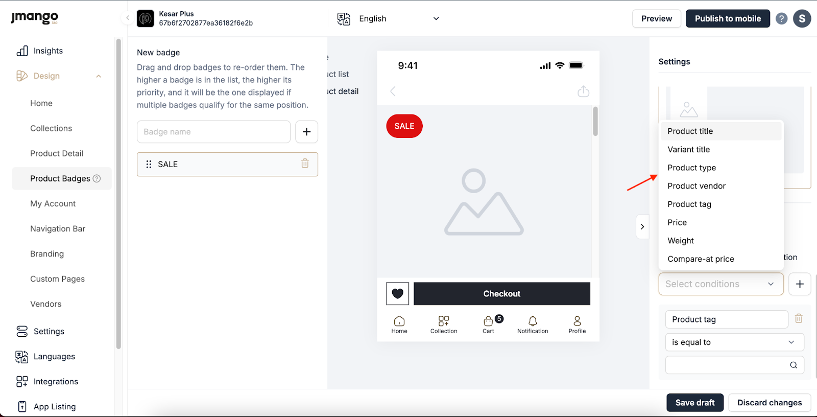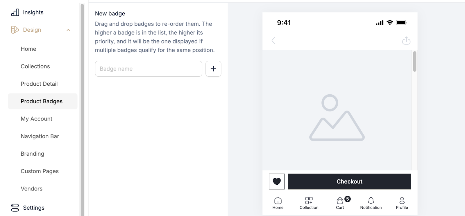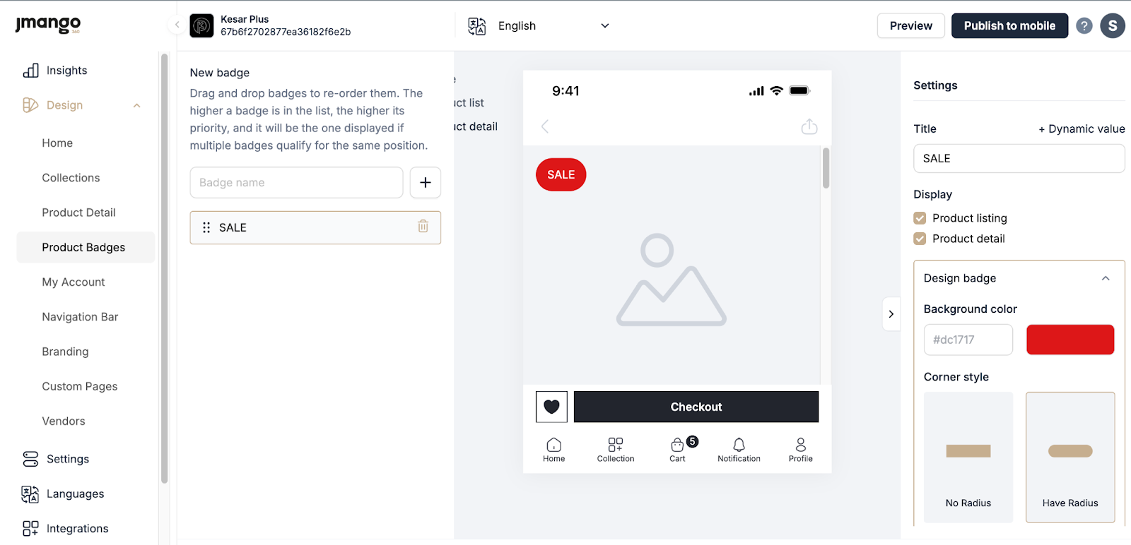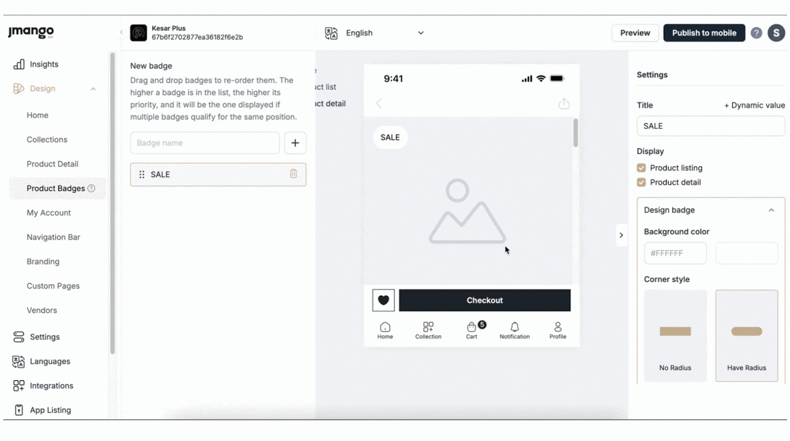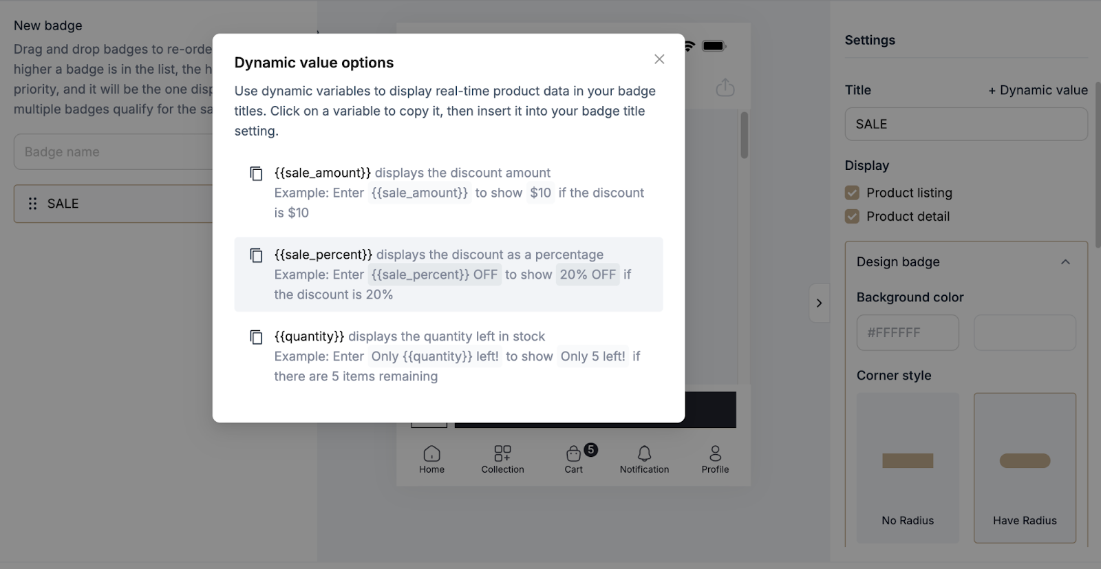 After customizing, preview the badge to see how it looks on your products. The preview will be shown in the phone preview area at the center of the screen, allowing you to see real-time changes before saving or publishing.
