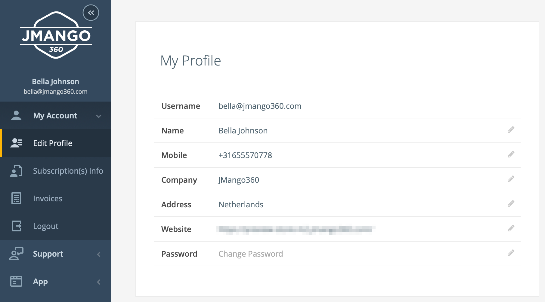 Account information and password can be changed at any time as you wish. Please log in to JMango360 Back Office and navigate to the My Account section in side menu.