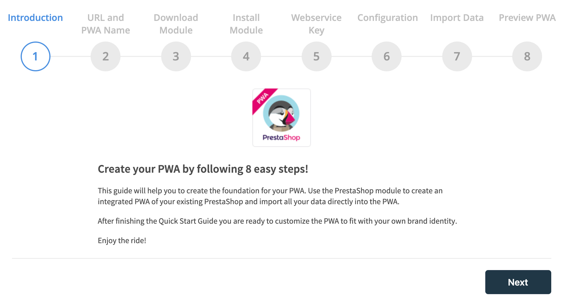 Progressive Web App > Start to start the Quick Start Guide of eight steps in total.