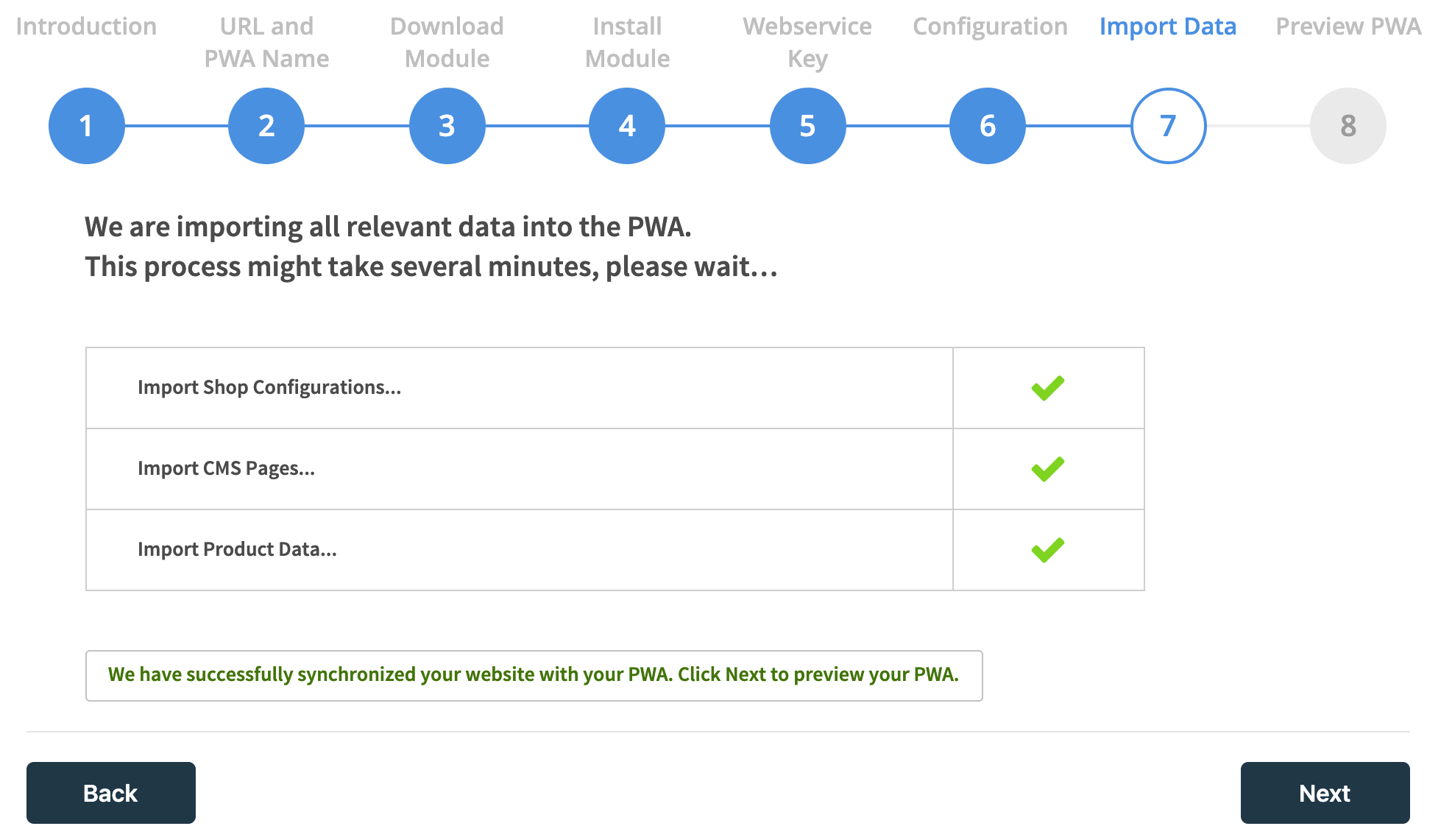 All relevant PWA data such as category list, pricing rules, discount rules, VAT rules, logistics, and payments, are imported into your PWA.