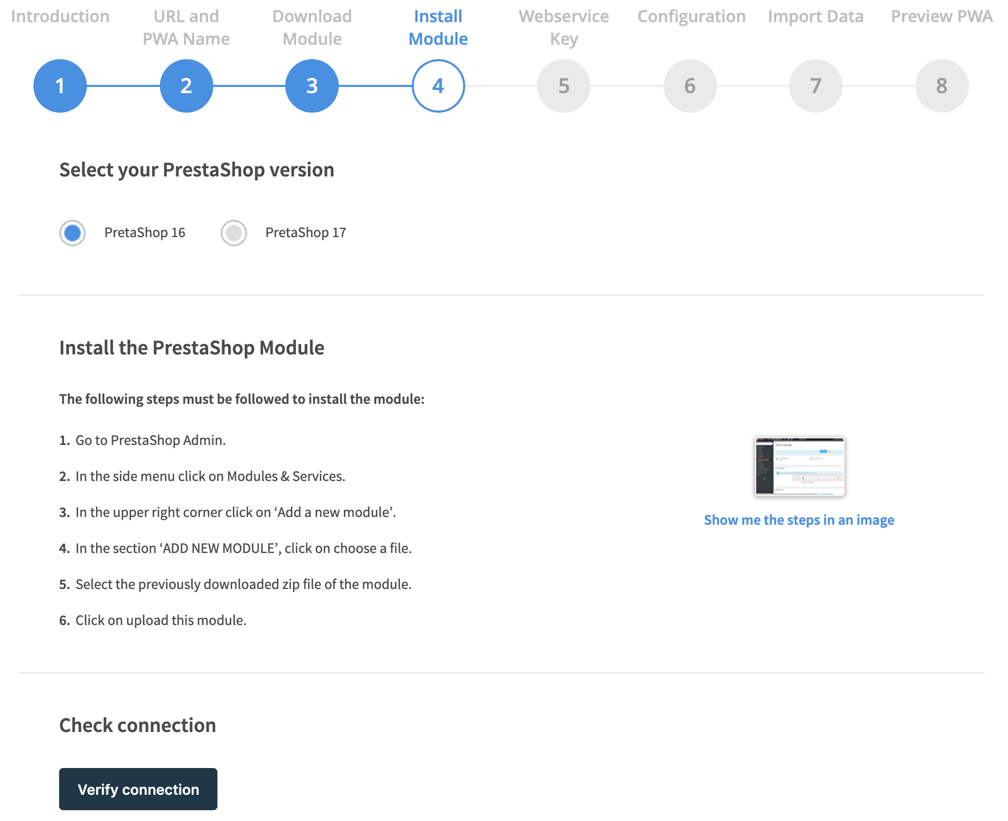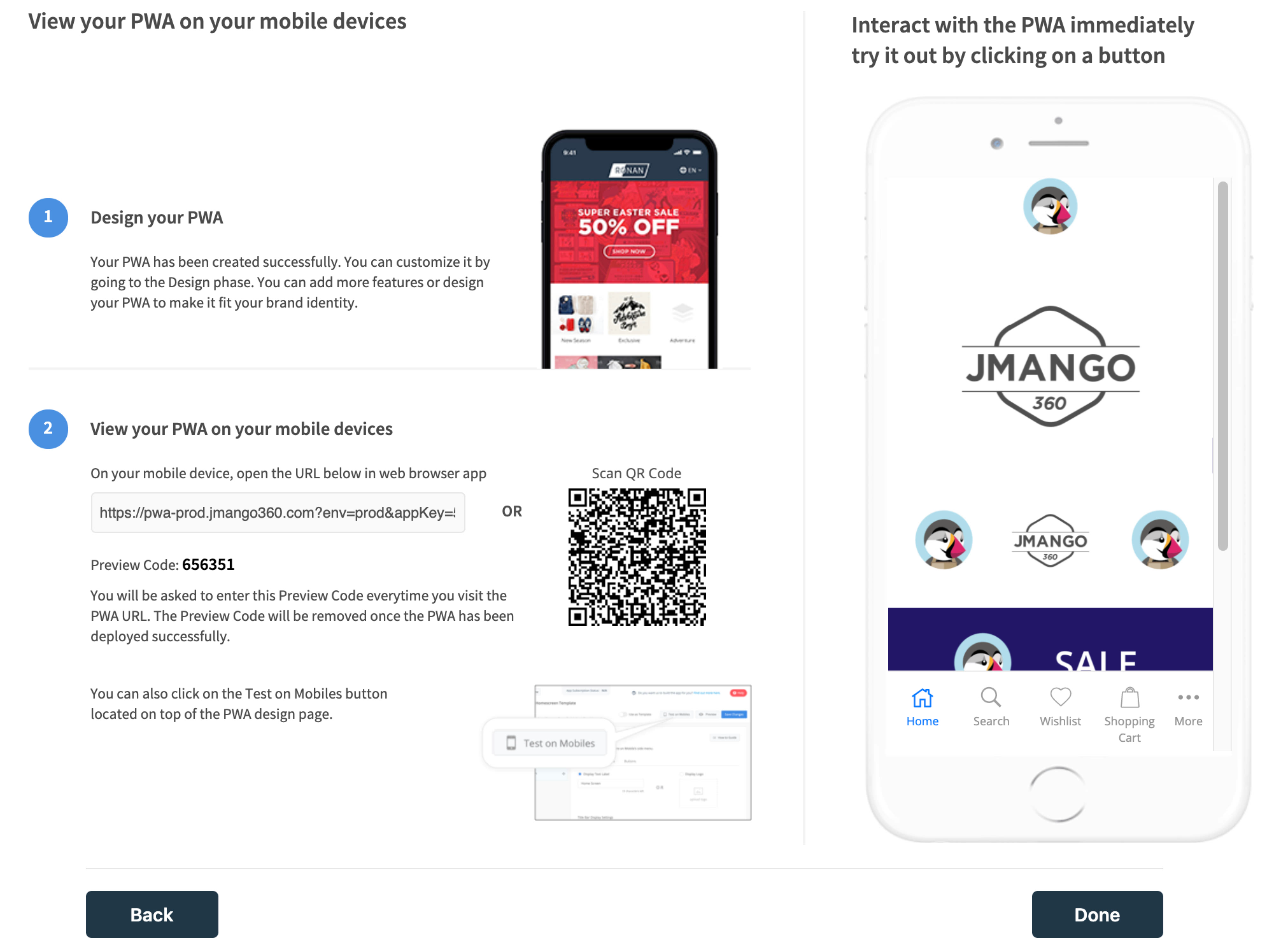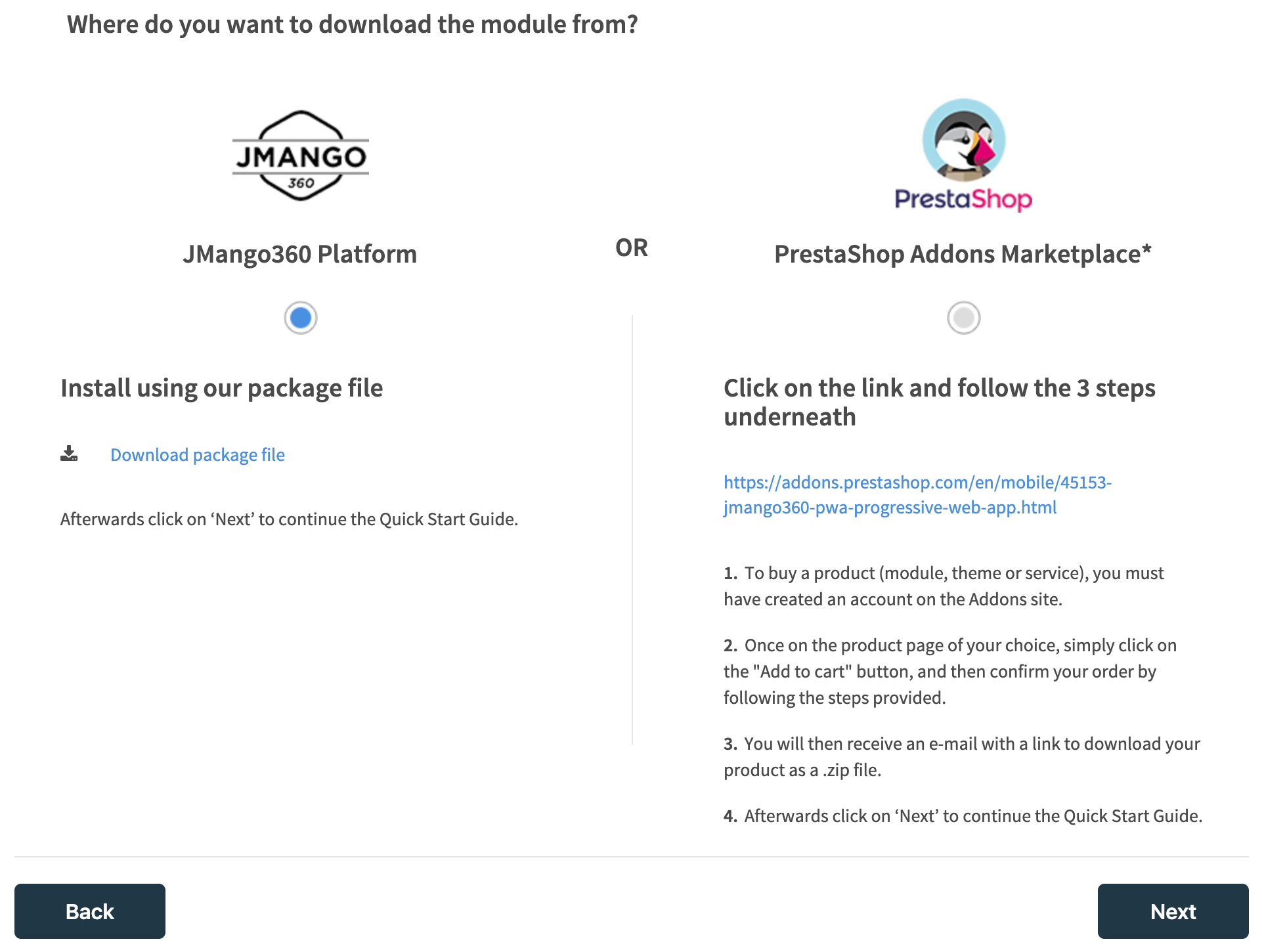 JMango360 makes it easy to convert your PrestaShop store into a PWA via our Quick Start Guide. After logging in to