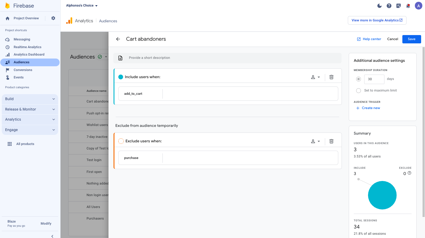 Audiences let you segment your users based on their event data and user properties. For example, you can create an audience of users who view products multiple times but don't make a purchase. Users will be automatically included in the audience once they meet your criteria, and when they no longer do, they will be automatically excluded.