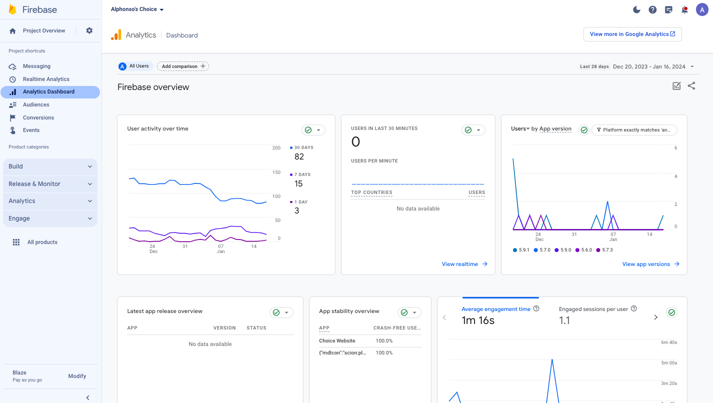 - Users: The Firebase dashboard offers a panoramic view of user metrics that illuminate your app performance, including total active users, users by app version, users by country, and users retention.