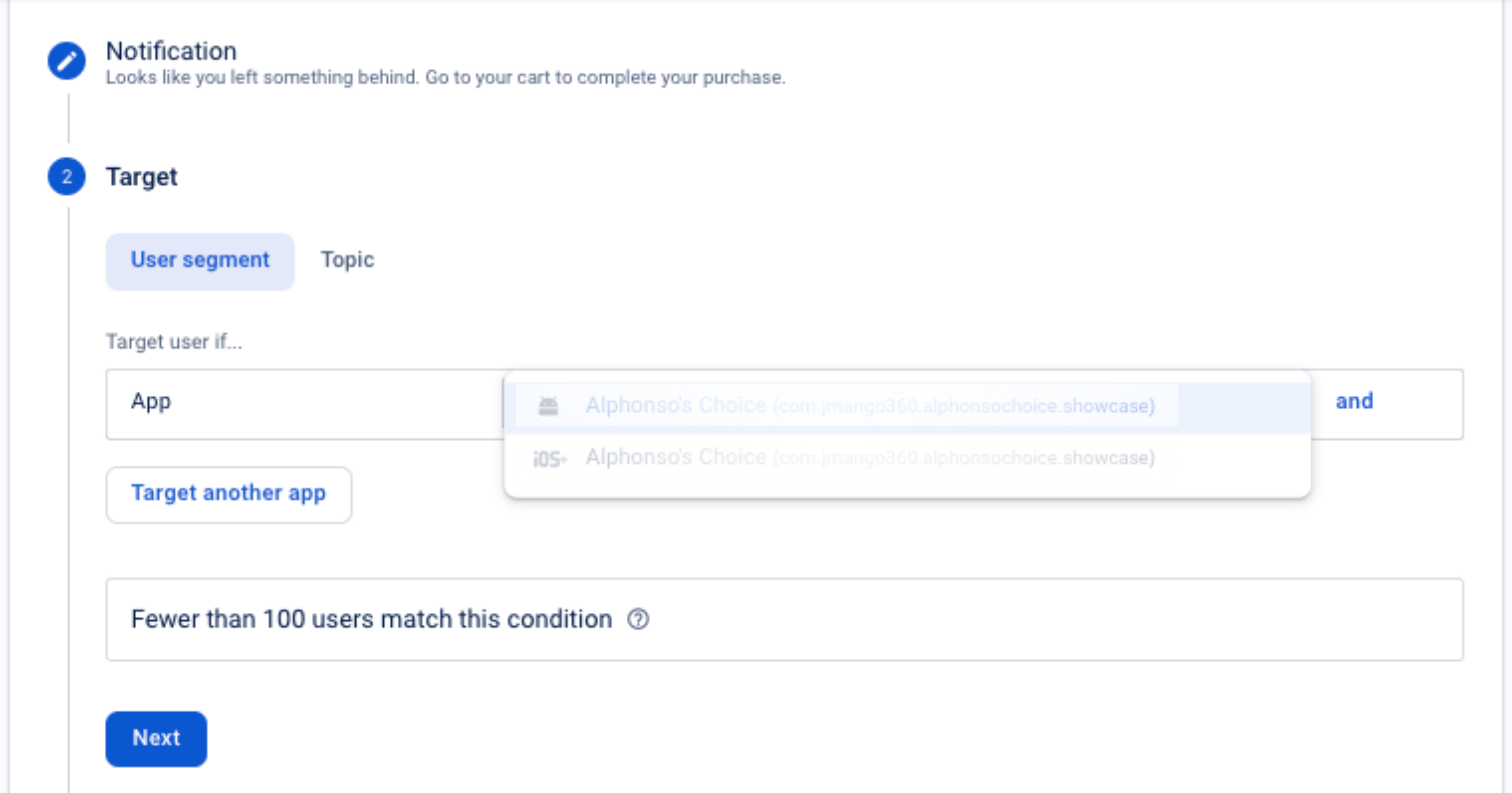 - Firebase will show the total number of app users eligible to receive this message. If this number is (too) low we recommend altering your targets.