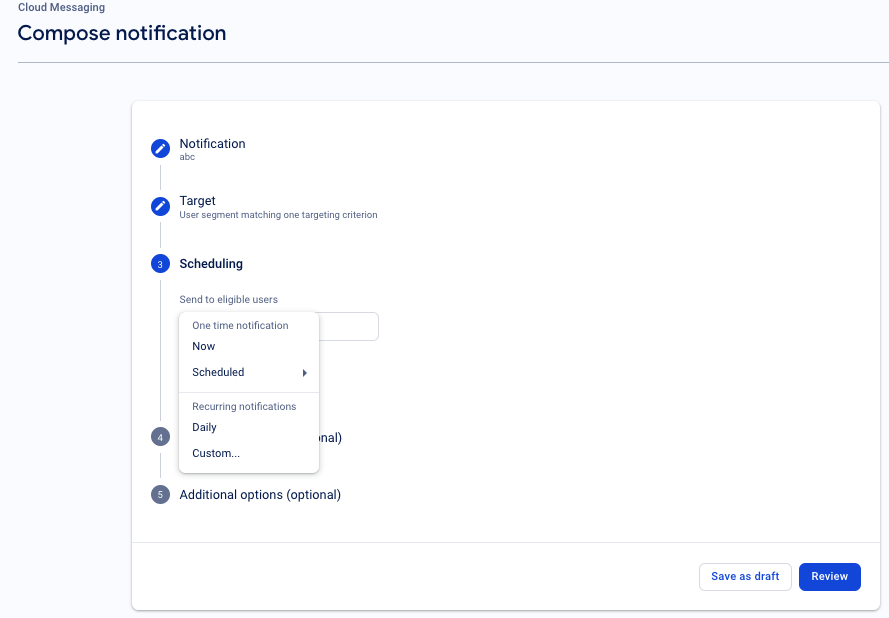 Firebase Cloud Messaging allows you to schedule notifications that only get sent to users in a specific Audience, at a specific frequency. Delivering segmented messages to the right users enhances user experience and increases the likelihood of user engagement.