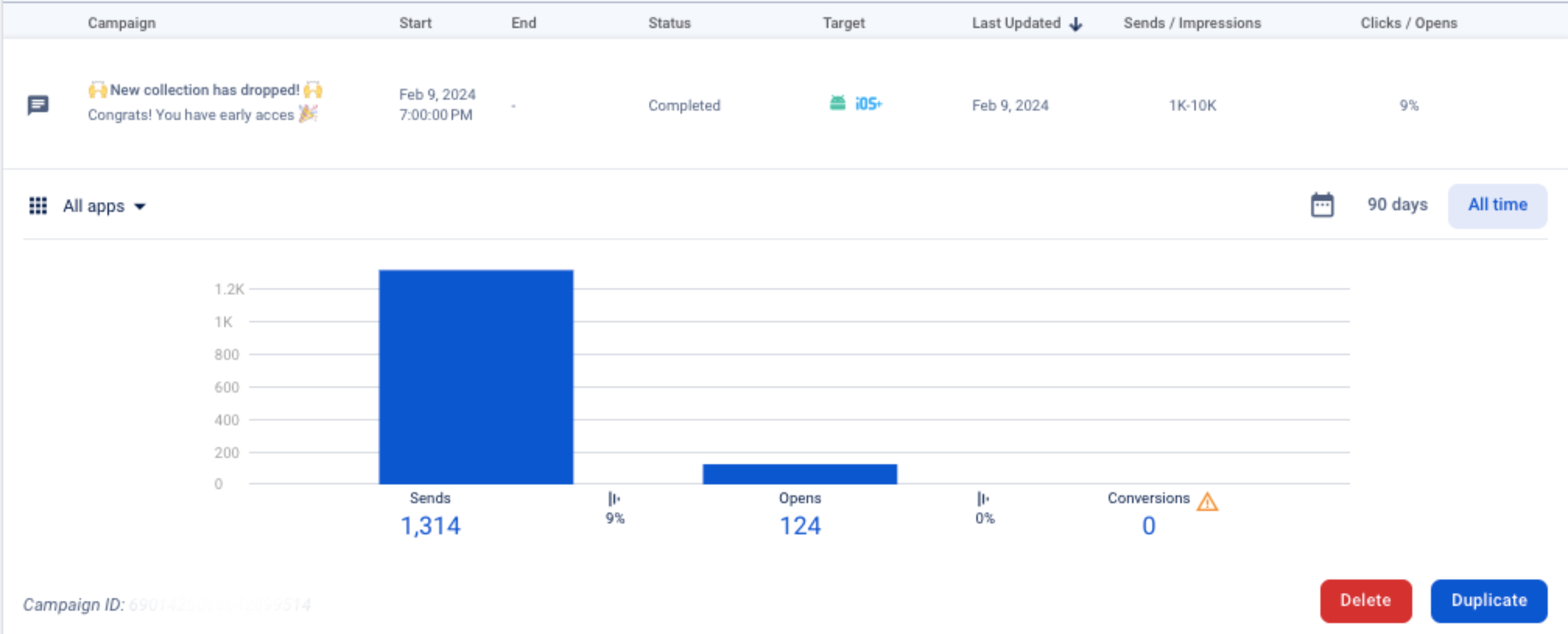 Tip: If you already have (successful) notifications, you can easily duplicate these messages! Select your message in the Campaigns list, click on the 3 dots at the end of the row, and click Duplicate.