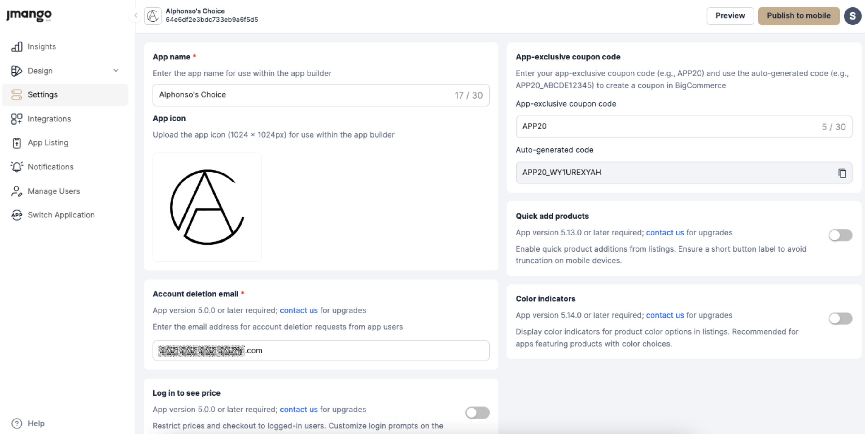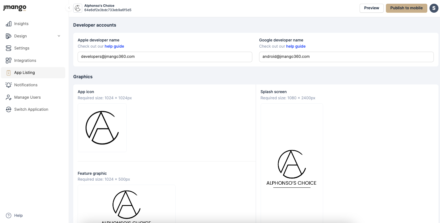 App listing: Before submitting a publish request, you are required to complete the App Store information, including the Apple and Google developer names, graphics, description, app categories, and business information. JMango360 will publish your app to the app stores on your behalf.