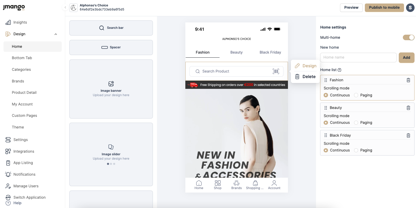Shape the look and feel of your app with precision. You can design your home screen, bottom tab, categories, product detail page, custom pages, and theme to create a visually appealing app and capture the attention of your customers.