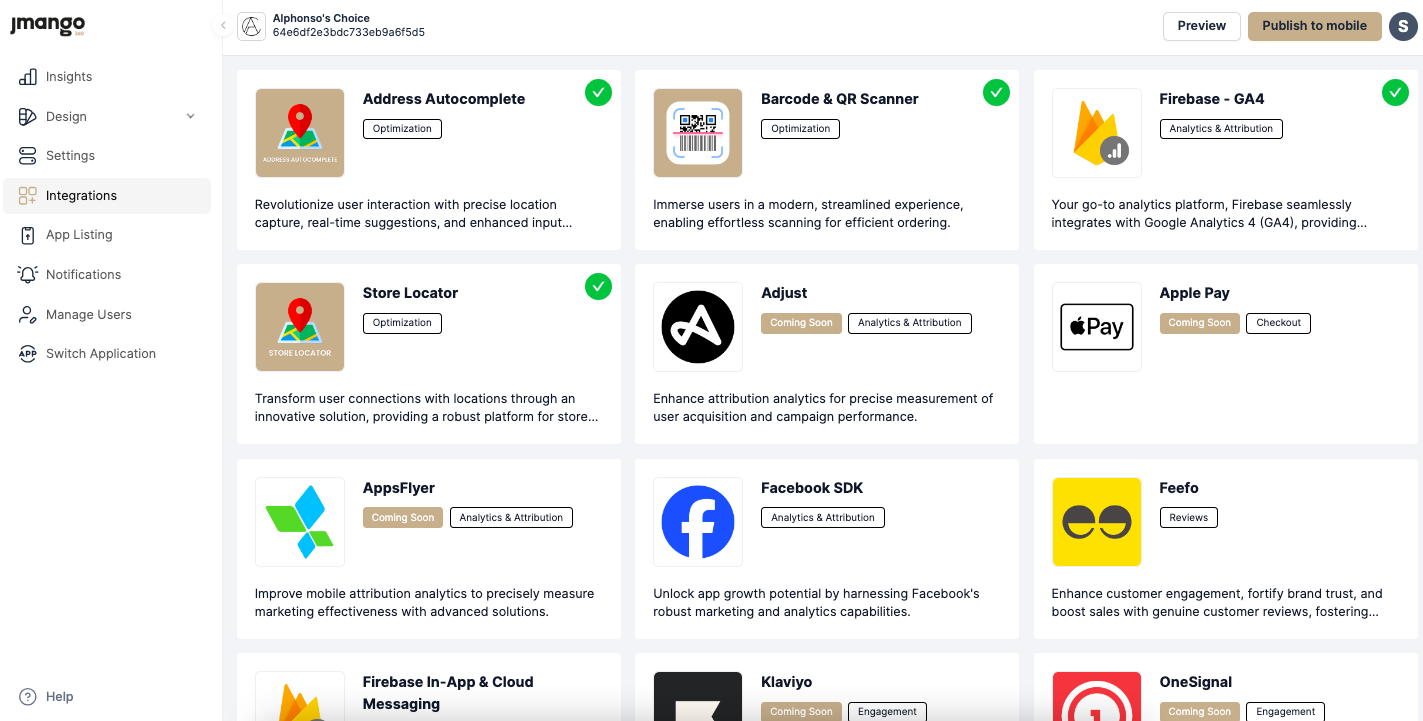 Integrations: Provide support for integrating with third-party services. Discover various integration options to enhance your app's capabilities, such as review, advanced search, analytics platforms, marketing, and more. The integrations available to you depend on your subscription level. Contact our Customer Success team for more information.