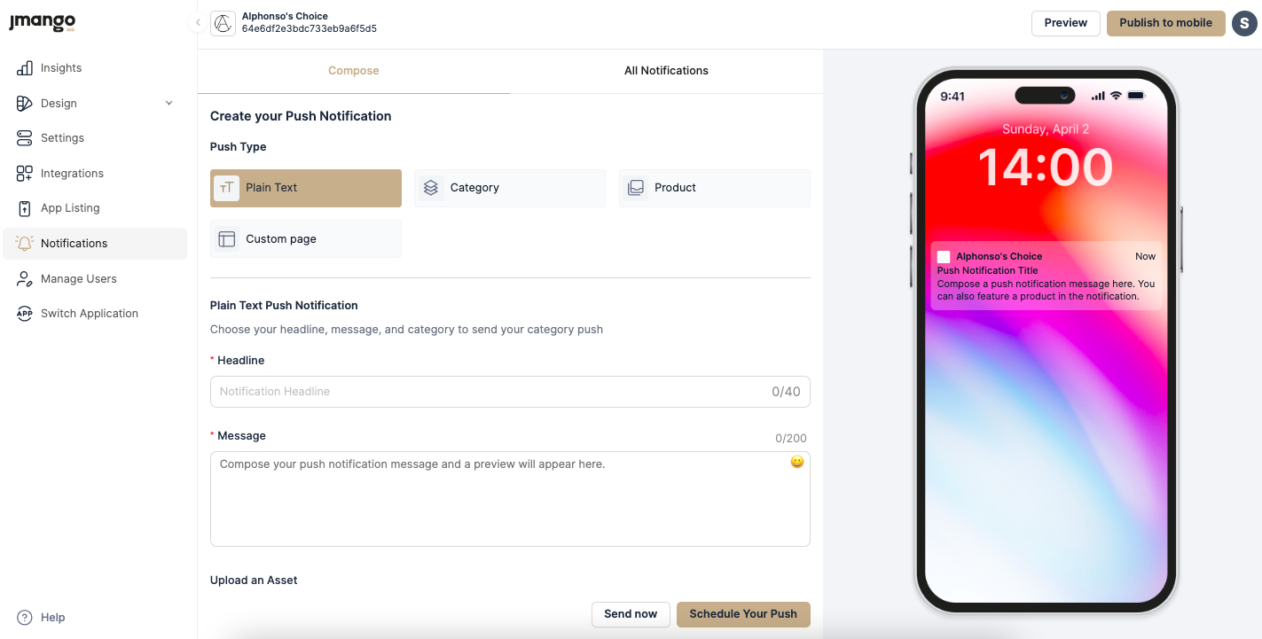 Notifications: Manage push notifications effortlessly through the notifications section. Engage with your users by sending targeted and timely messages, promotions, and updates to drive customer retention and boost engagement.