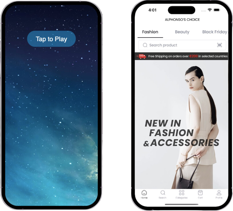 Categories: Our app builder offers configurability for building the categories page. You can make use of the elements to efficiently organize your products and optimize user navigation.