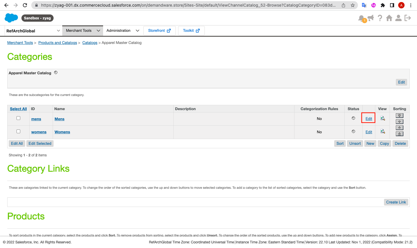 If you want to hide categories in the navigation bar, you can set it up by navigating to Merchant Tools > Products & Catalogs > Catalogs > Edit.