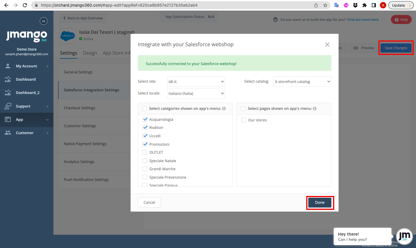Step 1: Log in to JMango360 backend, navigate to Settings > Salesforces Integration Settings > Integrate with your Salesforce Store.